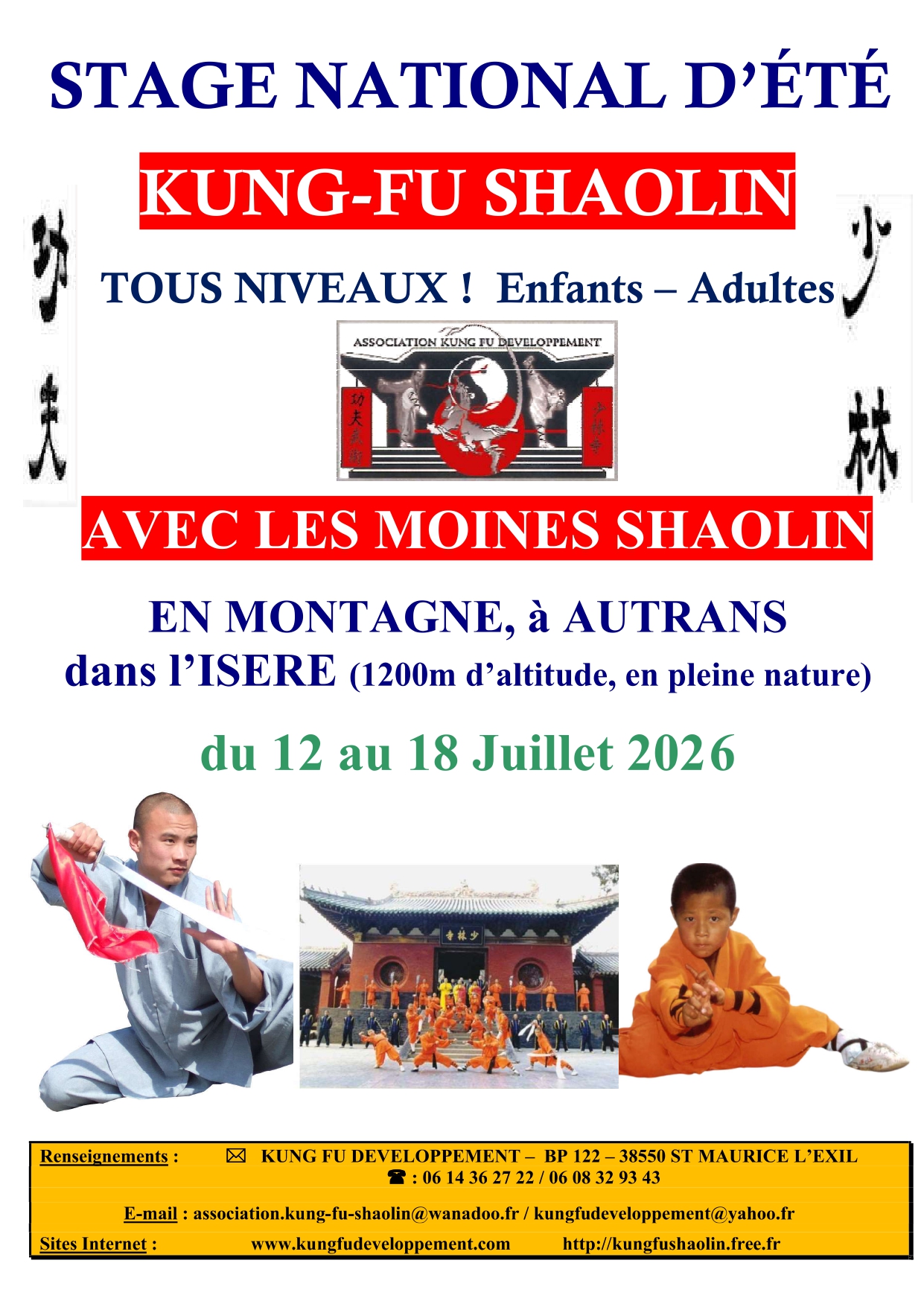 Du 12 au 18 juillet 2026, venez vivre une expérience exceptionnelle au cœur du Vercors !rnParticipez à un stage intensif de Kung-Fu traditionnel encadré par les Moines du Temple Shaolin. rnUn enseignement authentique alliant puissance, maîtrise du corps, discipline intérieure et philosophie ancestrale. rnCe stage est ouvert à tous les niveaux, débutants comme pratiquants confirmés.rnUne semaine immersive pour développer force, équilibre, concentration et énergie intérieure.